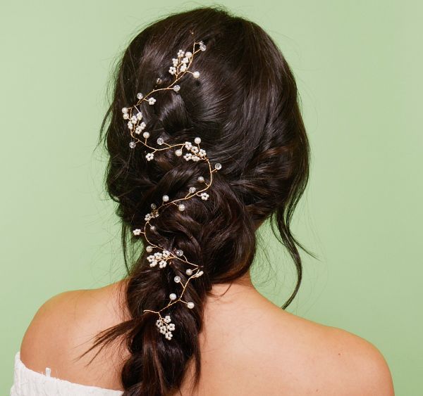 In terms of hair moments, a wedding is a biggie, and bridal hair must deliver. This ornate style offers a soft yet complex look with a sparkly floral rhinestone vine. It's perfect for an outdoor event with a natural theme. Get the full look here.
