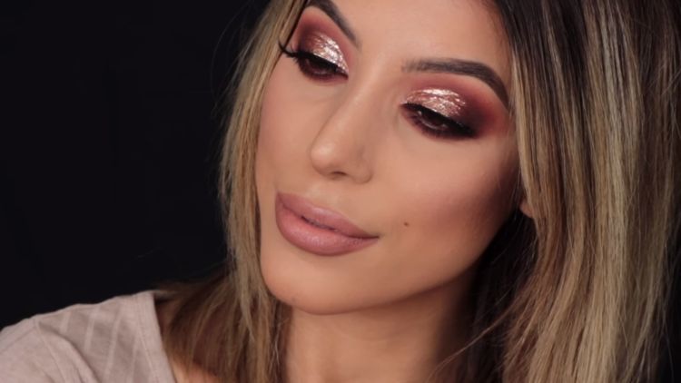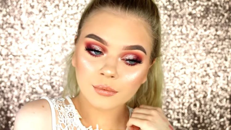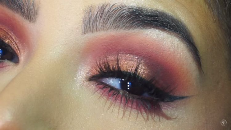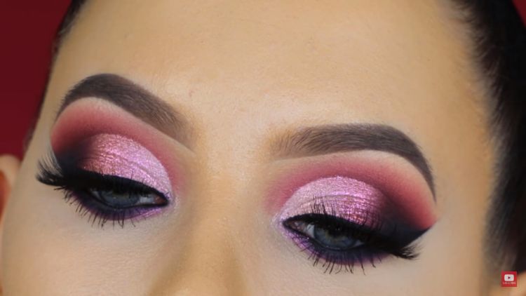 Honestly, what's not to love about this intensely pink look? With an intense cut crease, the rose gold glitter here is framed by pink, red and smokey liner for a sultry take on this rose gold makeup trend.