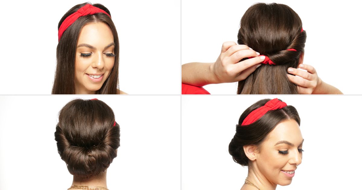 Need to get your hair off your face in a hurry? Grab a pretty headband and wrap sections of hair over it to create a quick updo. The front part of the headband remains exposed, so choose something that complements your outfit. Weave large sections over the headband, and then secure the loose ends inside the lower coil with bobby pins.