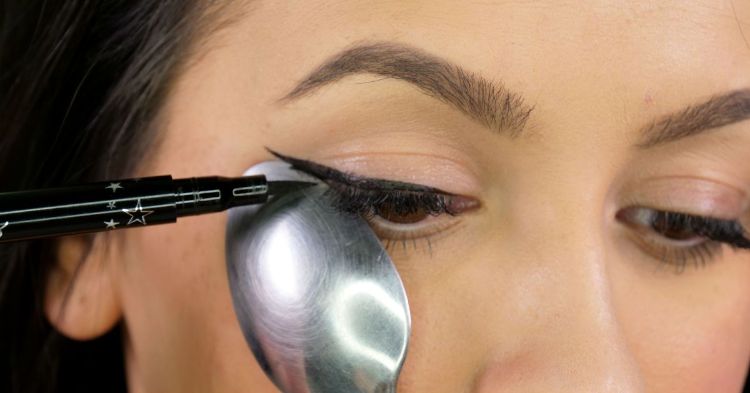 7. To create the perfect winged eyeliner, use a spoon or a piece of tape to create a straight edge for your wing. This will help you achieve a precise, clean line.